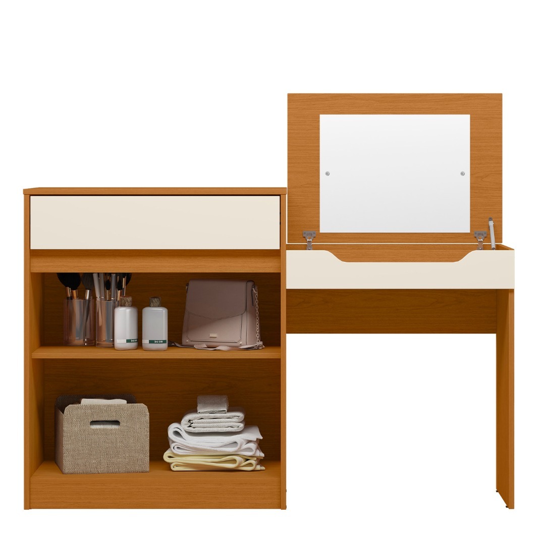 Este producto es solo online. El plazo de entrega es de 24 a 72 hs hábiles. Producto ArmableEl Tocador Trend es la solución perfecta para quienes buscan un espacio multifuncional y con estilo. Su diseño 2 en 1 te permite usarlo como escritorio o tocador gracias a la tapa basculante con pistón de gas, que revela un espejo atornillado ideal para tu rutina de belleza. Además, cuenta con un cajón amplio con rieles telescópicos para organizar tus accesorios con comodidad y orden.